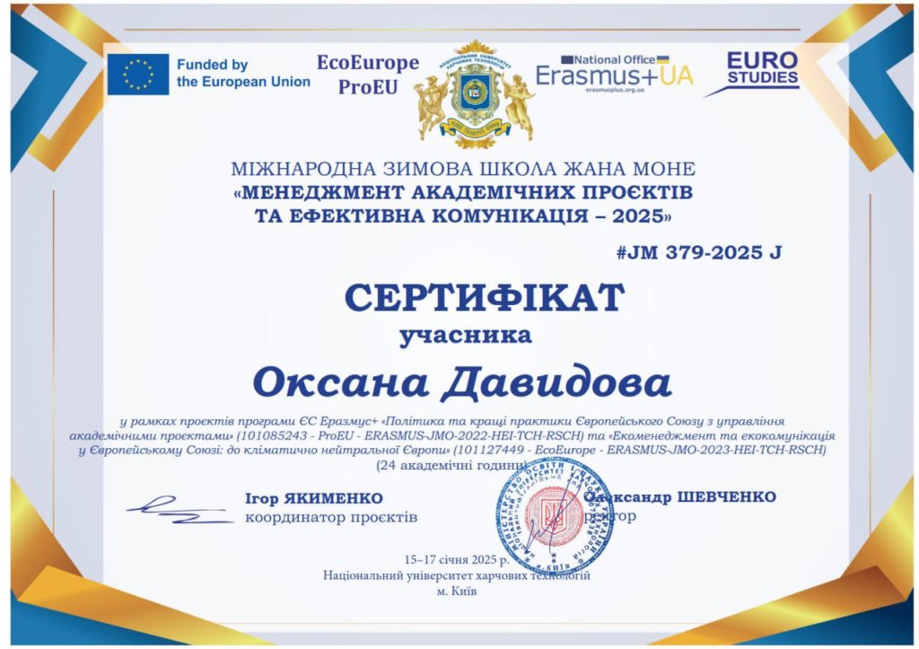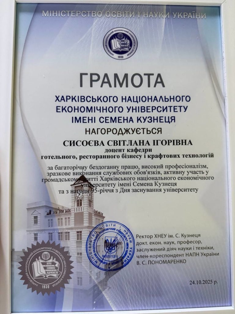 З 17 по 27 січня 2023 року прошли підвищення кваліфікації у Харківському національному економічному університету імені Семена Кузнеця завідувач кафедри готельного і ресторанного бізнесу, професор Давидова Оксана та доцент кафедри готельного і ресторанного бізнесу Хаустова Тетяна за темою: «Формування культури якості вищої освіти».