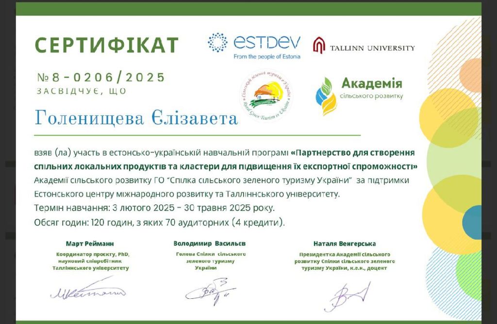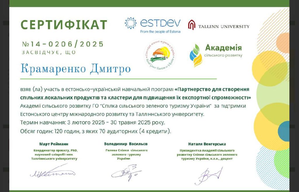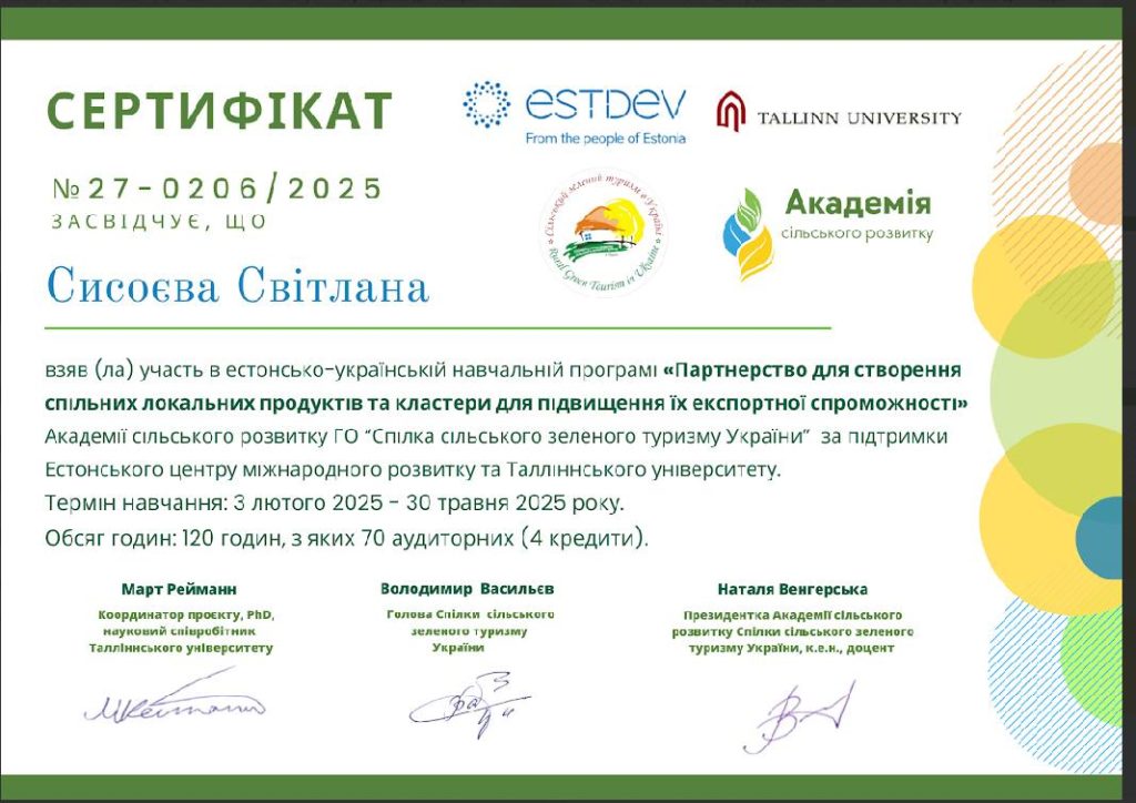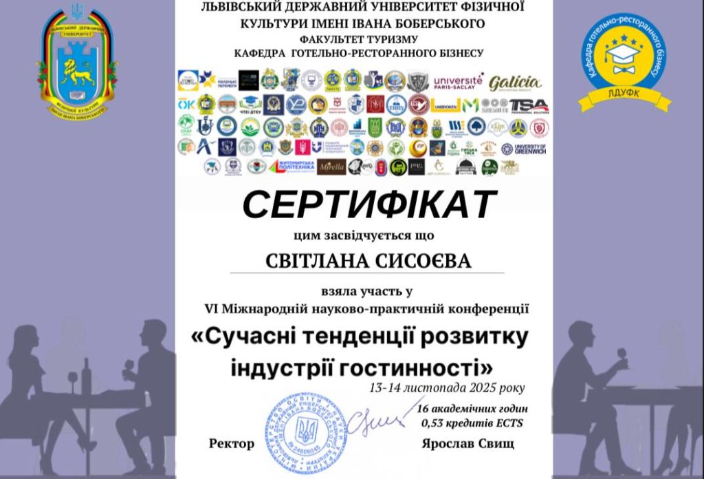 за темою: «Інноваційні методи та технології викладання в освітньому просторі за спеціальністю 241 Готельно-ресторання справа». Обсяг підвищення кваліфікації 180 годин (6 кредитів ЄКТС).
